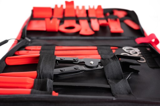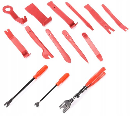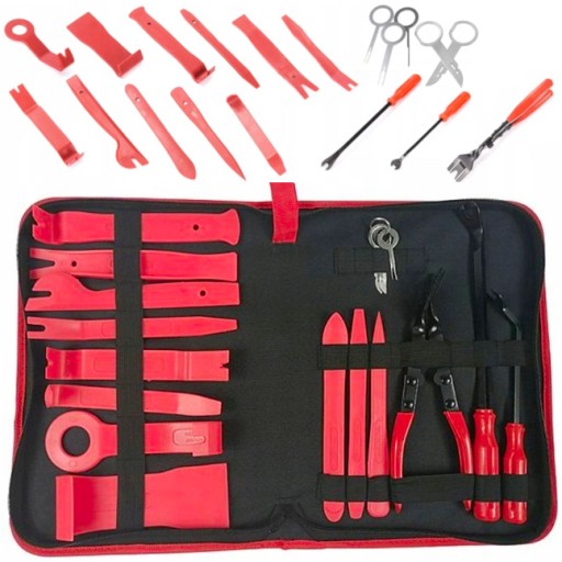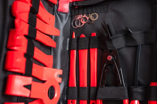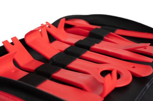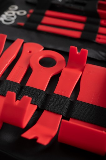 - Specjalistyczny zestaw zawierający ściągacze i klucze do demontażu radia, kostek, listew, spinek, oraz tapicerki w samochodach i urządzeniach technicznych.
