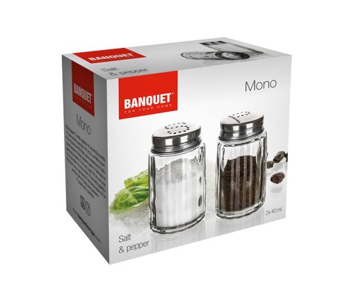 Zestaw 2 przyprawników - pojemniki wykonane ze szkła. Przyprawniki posiadają zdejmowane metalowe nakrętki. Zestaw zapakowany jest w kartonik, składa się z 2 pojemników na sól i pieprz