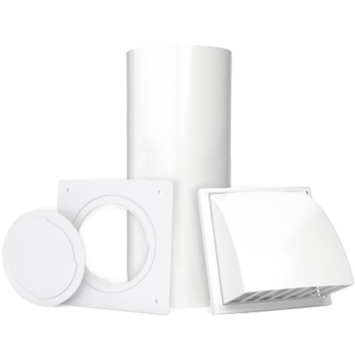Prezentowany zestaw instalacyjny pozwala na podtynkowe, profesjonalne i bezpieczne odprowadzenie rury wylotowej z klimatyzatora przenośnego na zewnątrz.
