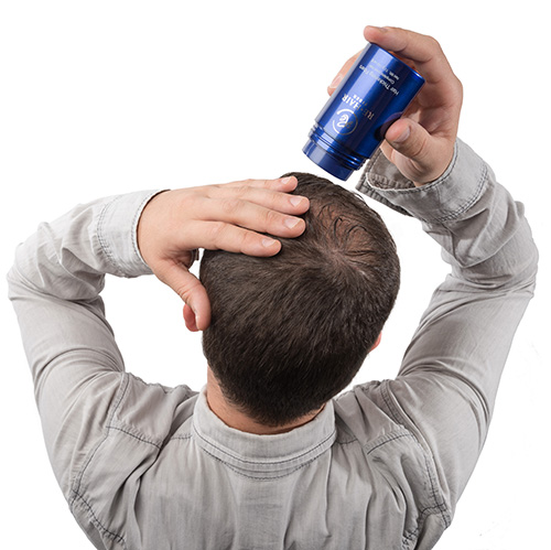 - Wysyp lub rozpyl mikrowłókna z puszki na wymagane miejsca, aż skóra głowy nie będzie widoczna