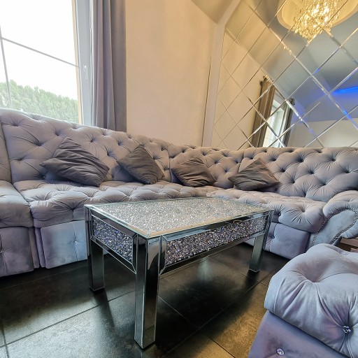 Dodatkowym ATUTEM jest kryształowy DEKOR umiejscowiony na bokach oraz blacie. Materiał użyty do produkcji dekoru perfekcyjnie imituje prawdziwy kryształ. Kryształki przepięknie odbijają światło i mienią się. Dekor jest osłonięty przeźroczystym tworzywem po bokach i solidnym blatem. Zapewniamy, że efekt jest niesamowity i na każdym zrobi pozytywne wrażenie. Wszystkie elementy stołu są bardzo starannie wykonane - nie posiadają ostrych krawędzi czy nierówności.