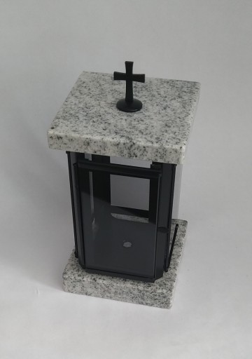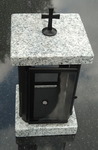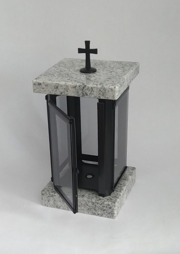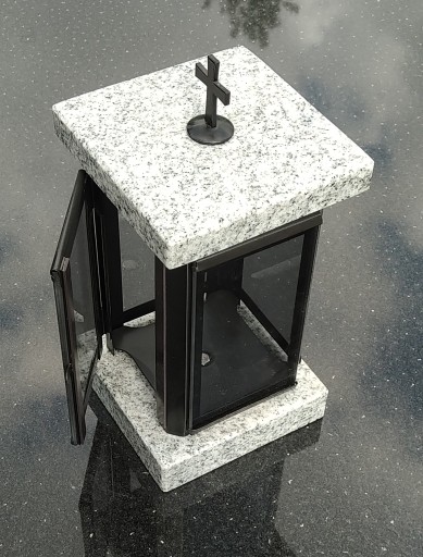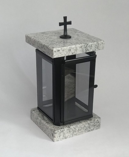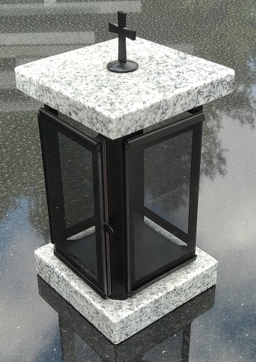 Lampion nagrobkowy wykonany z połączenia naturalnego jasnego granitu VISCOUNT WHITE i stali nierdzewnej malowanej proszkowo na kolor czarny. Piekny dodatek do pomnika. Wymiary lampionu: 13x13cm, wysokość 26cm. Istnieje możliwość wygrawerowania inicjałów na pokrywie lampionu.