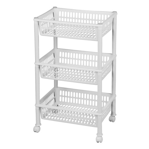 Regał wyposażony w trzy półki z otworami zapewniającymi lepsze odprowadzanie wody i wentylację w miejscach wilgotnych takich jak łazienka.