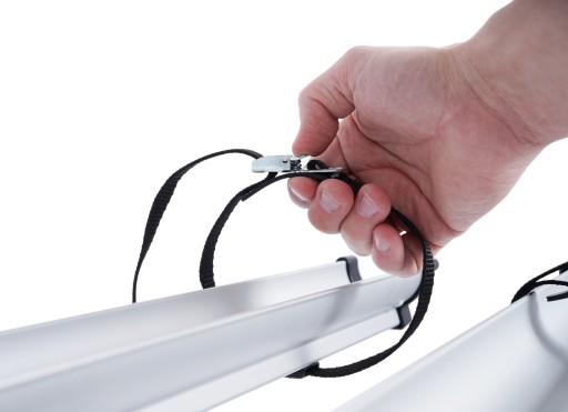 Bagażnik mocujemy do tylnej klapy bagażnika pojazdu przy pomocy 6 wytrzymałych pasów. Naciąganie pasów ułatwiają specjalne, zębate uchwyty z automatycznym zatrzaskiem. Pozwalają one również na szybki demontaż bagażnika - wystarczy wcisnąć przycisk, aby poluźnić napięte pasy.