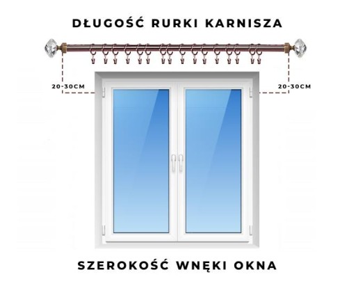 Aby dobrze dobrać karnisz do swojego okna drążek powinien być dłuższy o 20-30 cm od wymiaru wnęki okiennej z obu stron.