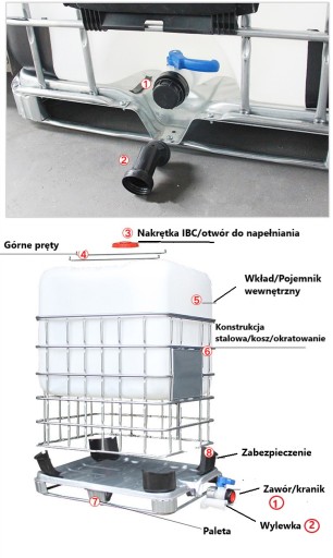 Składa się z nowego wkładu o pojemności 1000l i okratowania chroniącego naczynie przed naciskiem i rozpieraniem. Pojemnik jest koloru czarnego. Na innych aukcjach posiadamy zbiorniki RECO w kolorze neutralnym(przezroczystym). Transport pojemnika ułatwia podstawa paletowa ,do wyboru metalowa ,plastikowa oraz drewniana.(prosimy o wybór palety w wiadomości)