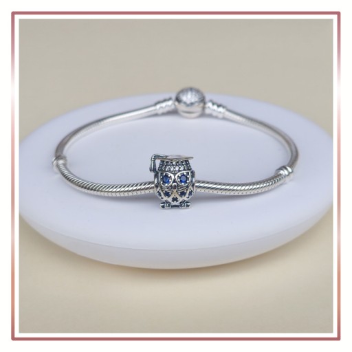 Charms w kształcie sowy wysadzany kryształami w niebieskim kolorze jest ponadczasowym symbolem mądrości.