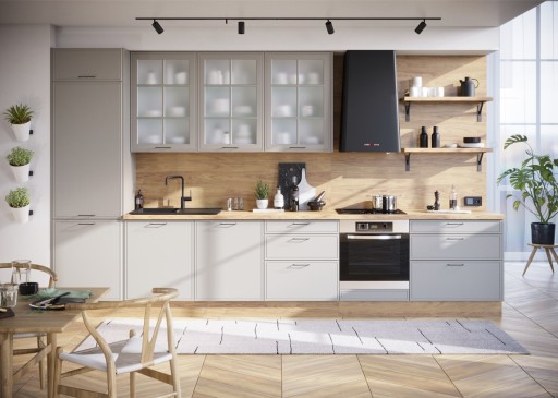 Zabudowa kuchenna, w której główną rolę grają szare matowe fronty nada każdemu wnętrzu ponadczasowego szyku i elegancji. Ważną rolę we froncie pełni subtelne frezowanie dzięki któremu kuchnia zyskuje nietuzinkowy wygląd. To bardzo ciekawe i oryginalne rozwiązanie w połączeniu z modną kolorystyką, która wprowadzi do pomieszczenia elegancję, nowoczesność ale i stonowany spokój. Ogromnym atutem kuchni w stylu klasycznym jest nie tylko duży wybór frezowań oraz ciekawych kolorów ale również bogata oferta uchwytów, które można dopasować do własnych potrzeb aranżacji wnętrza.