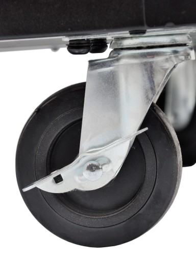 ✅ W wózku zostały zainstalowane 4 koła o średnicy 125 mm z których 2 są skrętne oraz posiadają blokadę kół zapobiegającą samowolnemu przemieszczaniu się wózka.