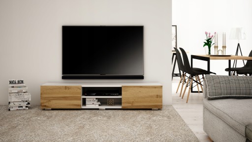 OPIS: W/S/G 45/160/40 cm- fronty w kolorze dąb wotan, po środku regulowana półka na sprzęt RTV o szerokości 52 cm, dwie przestronne komory otwierane dotykowo TIP-ON (bez uchwytu), płyta tylna szafki wykonana z HDF.