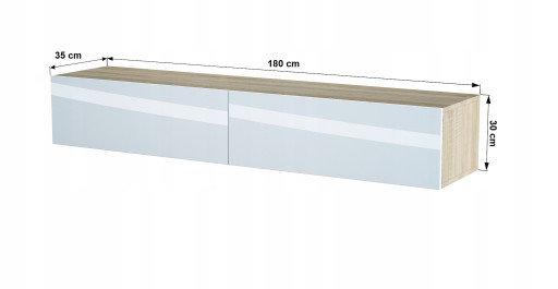 - Całkowite wymiary szafki: szerokość: 180 cm, wysokość: 30 cm, głębokość 35 cm