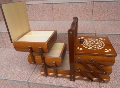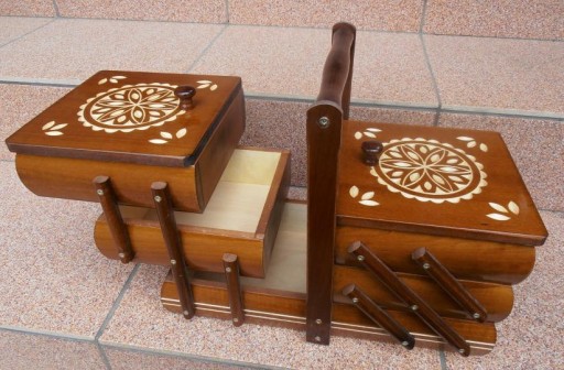 Kuferek idealnie służy do przechowywania nici i innych wyrobów pasmanteryjnych, może także służyć do przechowywania biżuterii, kosmetyków i innych drobiazgów.