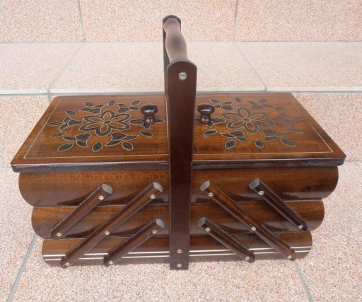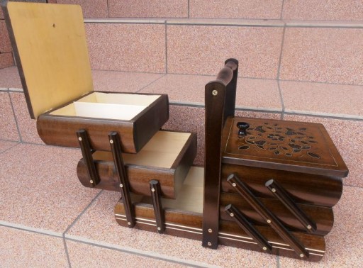 Kuferek idealnie służy do przechowywania nici i innych wyrobów pasmanteryjnych, może także służyć do przechowywania biżuterii, kosmetyków i innych drobiazgów.