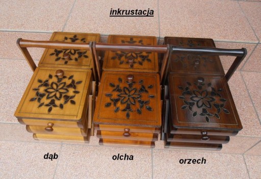 Niciarki - kuferki drewniane zdobione rzeźbą rozetą i inkrustacją - rękodzieło.