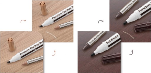 Naprawa następuje poprzez wypełnienie głębszego ubytku woskiem, oraz dorysowanie struktury drewna markerem