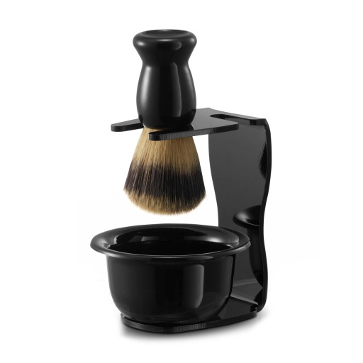Stojak posiada miejsce na pędzel i miseczkę, a także otwór na maszynkę do golenia, dzięki czemu zestaw zmieści się na minimalnej przestrzeni. Eleganckie czarne wykończenie sprawia, że zestaw do golenia wygląda elegancko i profesjonalnie, uzupełniając wystrój łazienki.