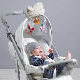 Osłonka ukryta jest w woreczku w kształcie chmurki.Chmurka z wiszącymi wiatraczkami bawi dziecko podczas podróży.Łatwy montaż pozwala na dopasowanie zabawki do budki wózka .gondoli lub fotelika samochodowego.Filtr przeciwsłonecznu 50+UPF UVA/UVB
