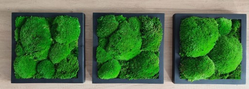Trzy obrazy, na których drewniane ramy wypełniliśmy mchem poduszkowym.