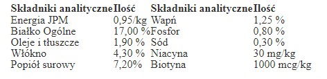 Kukurydza, gluten pszenny paszowy, pszenżyto, pszenica, jęczmień, śruta sojowa poekstrakcyjna GMO, śruta rzepakowa, kreda pastewna, chlorek sodu, wodorowęglan sodu, fosforan - 1Ca, bakterie kwasu mlekowego.