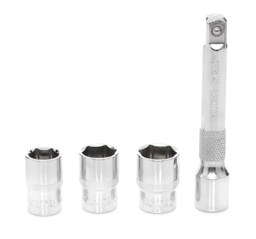 W zestawie 3 nasadki (17, 19, 21) i przedłużenie 1/2 "125 mm ze stali Cr-V