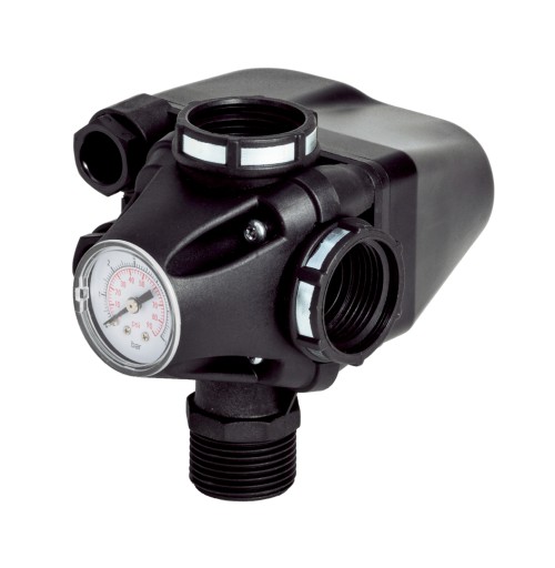 W sytuacji gdy ciśnienie w instalacji osiągnie poziom wyłączenia ustawionego na sterowniku, łącznik odcina zasilanie elektryczne i rozłącza pompę. Ponowne włączenie pompy następuje wskutek spadku ciśnienia w instalacji. Korpus wykonany z wysokiej jakości tworzywa sztucznego, umożliwiający połączenie całego wyłącznika z pompą lub zestawem hydroforowym w nieskomplikowany sposób.