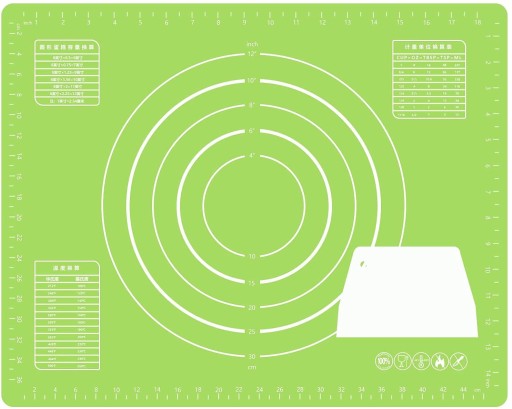 Mata wykonana jest z bardzo trwałego silikonu opornego na wysokie temperatury (proszę pamiętać, że mata nie nadaje się do użytku w piekarniku).