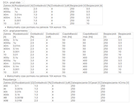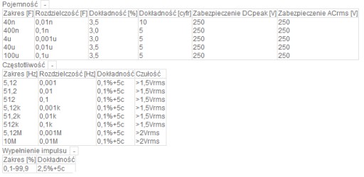 Dokładność: +- (% wartości wskazywanej + liczba cyfr najmniej znaczących), jeśli nie jest określona inaczej, dla temp 23 stopni C +- 5stopni i RH do 75%