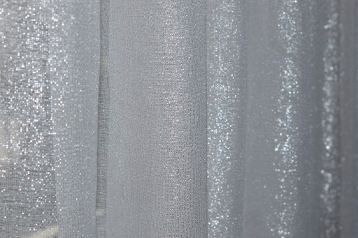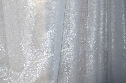 oprócz białej nitki naprzemiennie wpleciono srebrną mieniącą się nić przez co tkanina magicznie połyskuje podnosząc jej walor estetyczny.