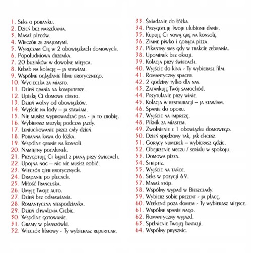 Zestaw składa się z 10 kuponów ze zdrapką, pod którą znajduje się Kupony miłości dla partnera.