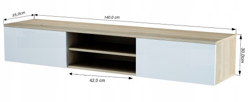 - Całkowite wymiary szafki: szerokość: 140 cm, wysokość: 30 cm, głębokość 35 cm