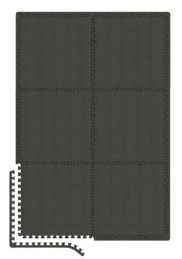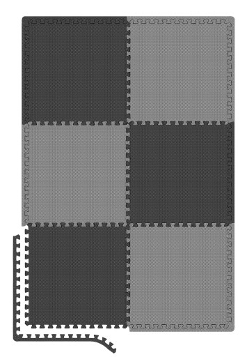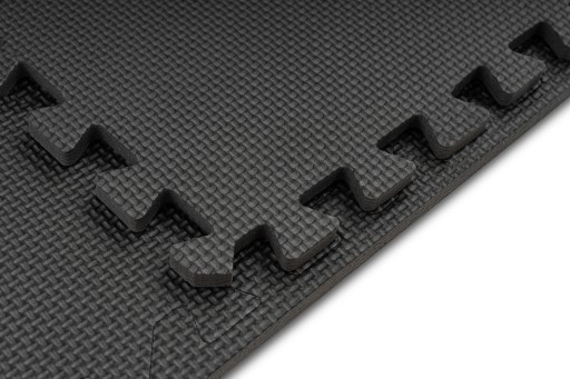 Opakowanie produktu zawiera sześć dopasowanych do siebie płytek, każda o wymiarach 60 x 60 cm oraz 12 obrzeży. Łączenie poszczególnych części maty jest bardzo łatwe i intuicyjne. Krawędzie elementów precyzyjnie przylegają do siebie tworząc spójną powierzchnię.