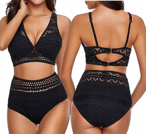 Strój kąpielowy bikini, wysoki stan majtek z delikatnym usztywnieniem biustu, piękny koronkowy wzór, klasyczny, a zarazem ekstrawagancki