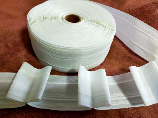 taśmę białą, bawełnianą o szerokości 5-6cm o marszczeniu w proporcji 1:2,