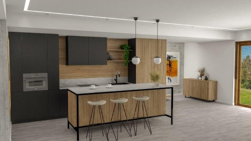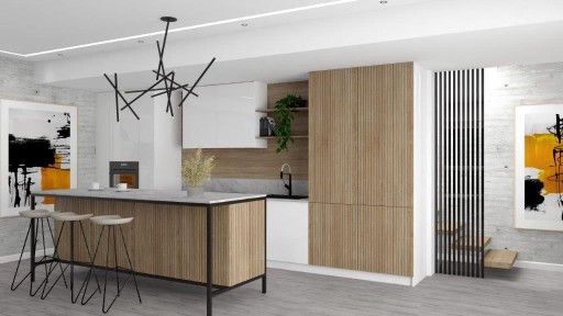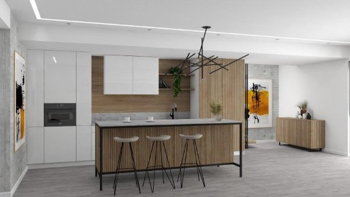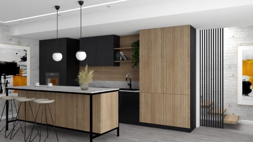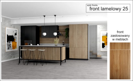 - Widoczne boki szafek oraz cokołu dolnego (w dowolnych wymiarach) możliwość przygotowania całości korpusów z płyty fornirowanej pod kolor frontów.