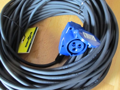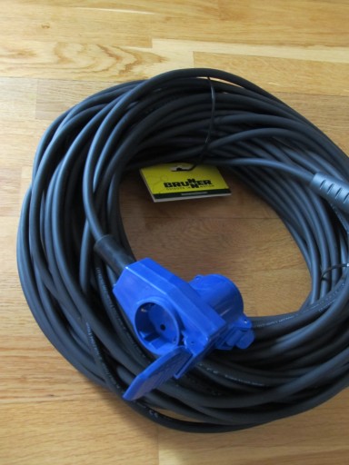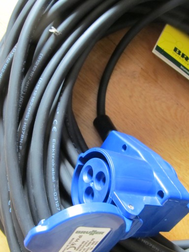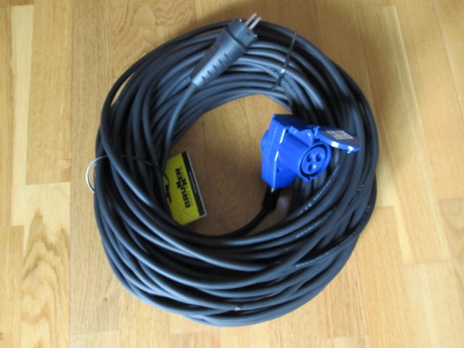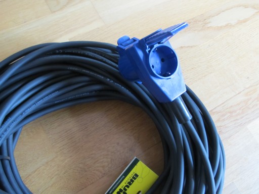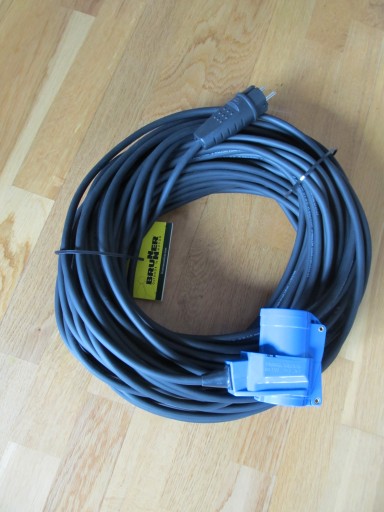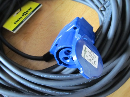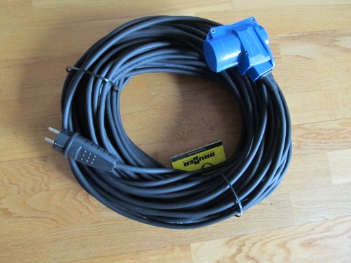 Oferuje do sprzedaży nowy przedłużacz kempingowy 25m gniazdo kątowe CEE z dodatkową wtyczką na 230V, wtyczka gumowa 230 V (16A) do przyczep kempingowych, kampera, łodzi, itp.