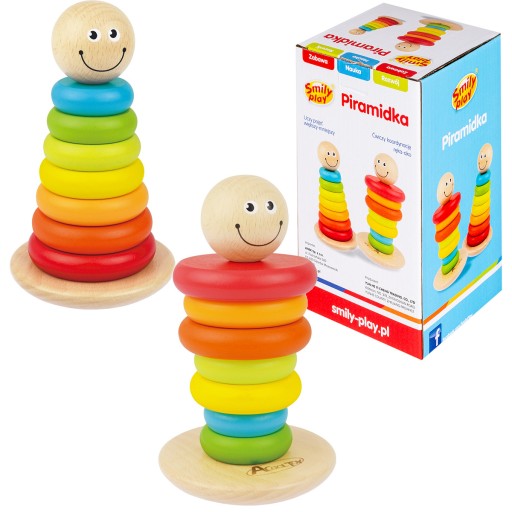 Kolorowa , drewniana piramidka, która może być również Wańką- Wstańką. Składa się z 7 krążków, chwiejącej się przy poruszaniu podstawy oraz uśmiechniętej główki. Wykonana z drewna dobrej jakości, pozbawiona ostrych krawędzi, by Twój maluszek mógł bezpiecznie się bawić.