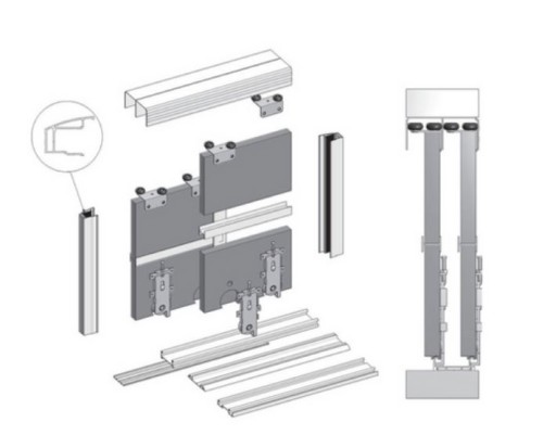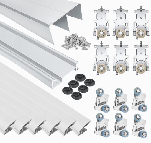 W skład zestawu wchodzą wszystkie profile i okucia które potrzebujesz do skręcenia drzwi przesuwnych.