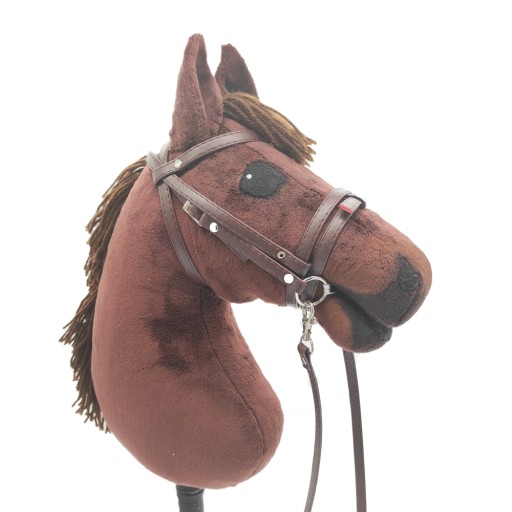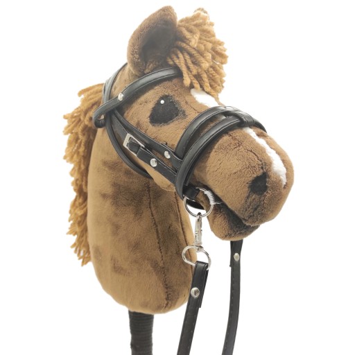 Oferujemy Państwu regulowane ogłowie anatomiczne dla hobby horsa wraz z wędzidłem, wykonane z ekoskóry oraz napowane.