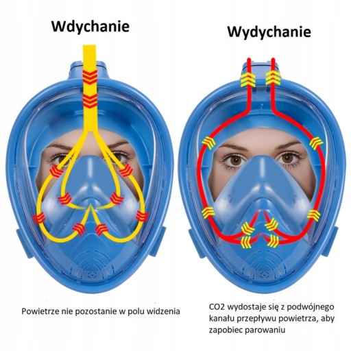 Wdychane powietrze nie przechodzi przez pole widzenia. Dzięki temu maska nie będzie parować. Dodatkowo CO2 wydostaje się z Maski do nurkowania podwójnym kanałem co znacznie usprawnia jego wydalenie.