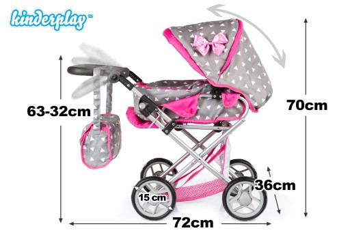 Wózek dla lalek od firmy Kinderplay to prześliczna zabawka z pewnością spodoba się każdej dziewczynce. Utrzymany w tradycyjnej stylistyce i atrakcyjnych kolorach. Trwała rama wózka wykonana jest z metalu i posiada funkcję składania w dół. Rączka z miękkim uchwytem, zapewnia wygodę prowadzenia. Wózek przeznaczony do zabaw w domu, jak i na dworze posiada piankowe koła.