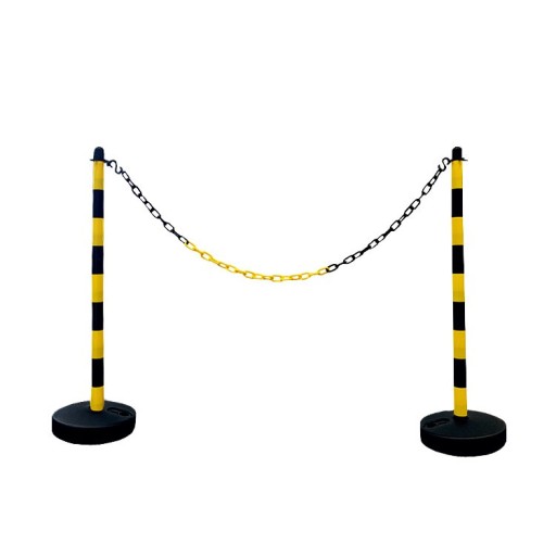 Słupki odgradzające są wykonane z trwałego tworzywa sztucznego. Posiadają okrągłą podstawę, którą należy wypełnić piaskiem lub wodą. Umożliwiają stałe i tymczasowe wygrodzenia terenu, a żółto-czarna kolorystyka zapewnia dobrą widoczność.