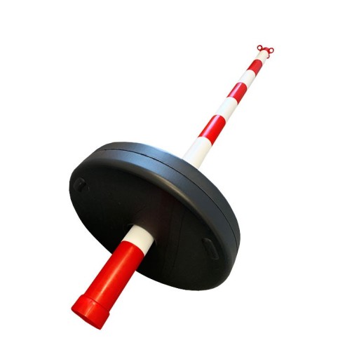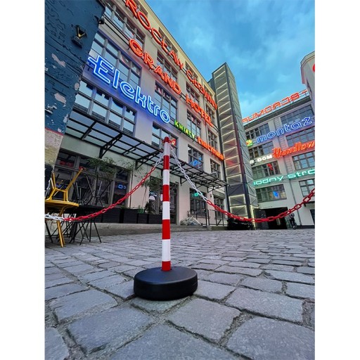 Słupki odgradzające są wykonane z trwałego tworzywa sztucznego. Posiadają okrągłą podstawę, którą należy wypełnić piaskiem lub wodą. Umożliwiają stałe i tymczasowe wygrodzenia terenu, a biało-czerwona kolorystyka zapewnia dobrą widoczność.