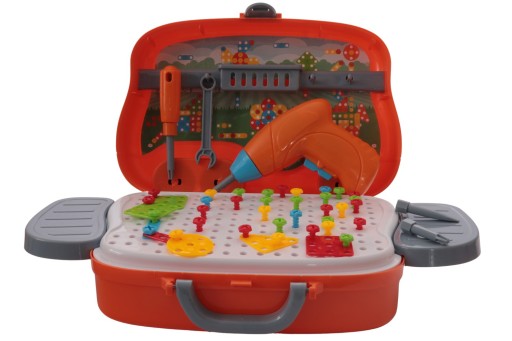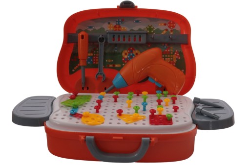 Walizka młodego majsterkowicza przypomina kształem samochód. W środku walizki znajduje się tacka, na której dziecko może tworzyć przeróżne kontrukcje. Do samego stworzenie kontrukcji znajdziemy w zestawie śrubokręt i wiertarkę. Wiertarka jest zasilania bateriami 2xAA. Wszystkie elementy tego wspaniałego zestawu są zawarte na zdjęciu.