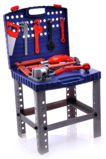 Zabawka posiada solidny stolik z wygodną tablicą narzędziową. Zestaw zawiera mnóstwo dziurek i uchwytów co pozwoli mieć najpotrzebniejsze narzędzia zawsze pod ręką. Stolik dodatkowo wyposażony został w zagłębienia na drobiazgi, które pozwalają zachować porządek wśród dużej liczby przeróżnych narzędzi.