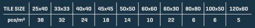 Liczby podane w tabeli są minimalnymi ilościami koniecznymi do zastosowania na jednym metrze kwadratowym płytek o danym wymiarze, bez uwzględniania wstawek, docinek i sztukaterii.