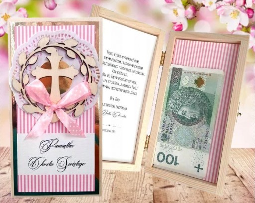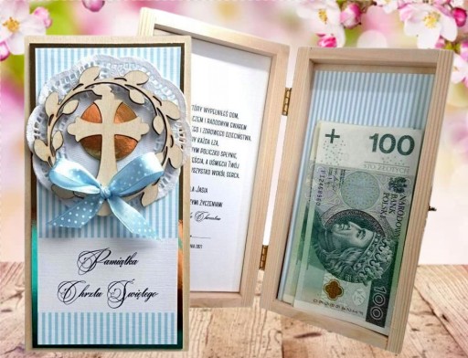Drewniane pudełeczko z personalizowanymi życzeniami i miejscem na gotówkę lub inny prezent.