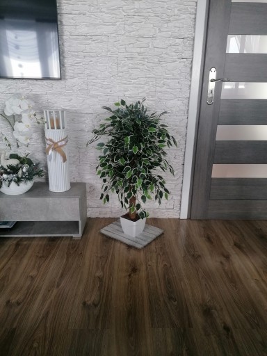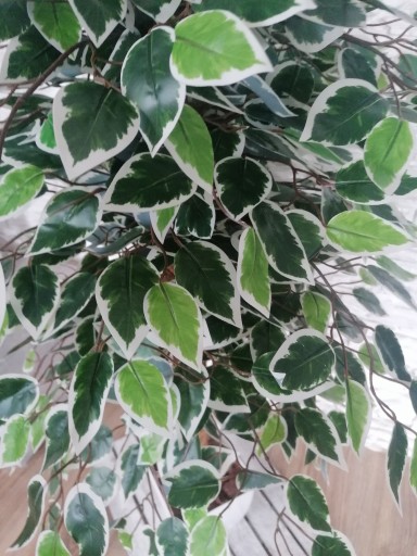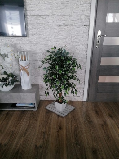 Oferuję sztuczne drzewko Fikus Benjamina .Liście zielono - białe . Wysokość +/-100 cm z donicą . Wykonane w białej kwadratowej donicy. Liście na drzewku najwyższej jakości. Szerokość drzewka ok. 45-50 cm.
