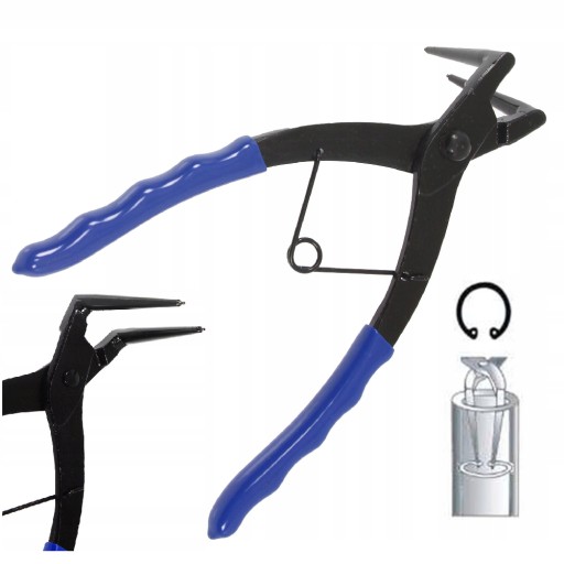 Szczypce do pierścieni Seegera wewnętrzne wygięte. Wydłużona konstrukcja umożliwia pracę w trudno dostępnych miejscach. Zastosowanie: montaż i demontaż pierścieni osadczych wewnątrz zacisków hamulcowych.