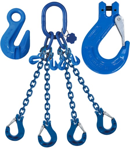 Zawiesie łańcuchowe czterocięgnowe z hakami z zabezpieczeniem wykonane z komponentów w klasie jakości 10 charakteryzują się zwiększonym udźwigiem o 25% w stosunku do zawiesi w klasie 8. Zawiesia wyposażone dodatkowo w haki skracające /HS/ umożliwiające płynną regulację długości zawiesia w zależności od potrzeb i pozwalające na aktywną możliwość wypoziomowania ładunku