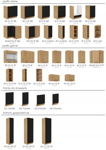 Przedmiotem sprzedaży jest zestaw mebli kuchennych MODENA 5 Czarny mat / Dąb artisan.